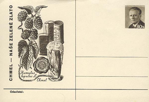 На карточке: побеги хмеля, тюки с собранным хмелем, стакан с пивом, печать со знаком качества чешского хмеля.