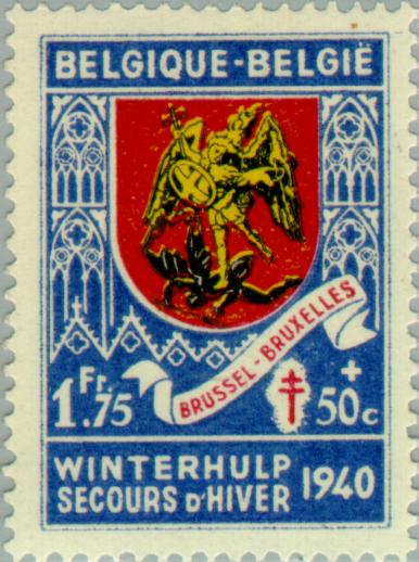 Бельгия, 1940, 1.75 fr. + 50 c. П. глубокая. 14 х 13 (1/2). многоцветная