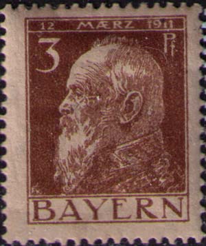 Германия. Бавария, 1911, 3 pf. П. высокая. 14 х 14 (1/2). темно-оранжево-коричневая