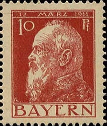Германия. Бавария, 1911, 10 pf. П. высокая. 14 х 14 (1/2). красно-коричневая