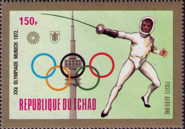 Мюнхенская телебашня, олимпийские кольца, герб Мюнхена, фехтовальщик.