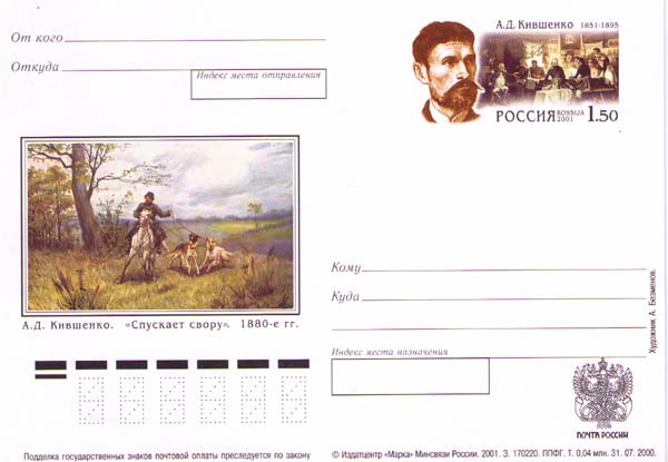 На марке: портрет художника и его картина «Военный совет в Филях» (Алексей Кившенко, 1880, Москва, Государственная Третьяковская галерея). На картине изображен военный совет в избе крестьянина А. Фролова в деревне Фили 13 сентября. Слева сидит Кутузов, за его спиной стоит дежурный генерал Кайсаров, на лавке у окна сидят Остерман-Толстой, Раевский, Коновницын, под иконой Барклай-де-Толли, далее Уваров, Дохтуров, стоит Ермолов, спиной к зрителю сидят Толь и Беннигсен.
