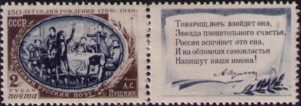 «Александр Пушкин среди друзей-декабристов в Каменке» (Дмитрий Кардовский, 1934, Санкт-Петербург, Всероссийский музей Пушкина). На картине изображены Василий Давыдов, Михаил Орлов, Александр Раевский, Николай Раевский, Константин Охотников, Иван Якушкин. На купоне — цитата из стихотворения Пушкина «К Чаадаеву» (1817).