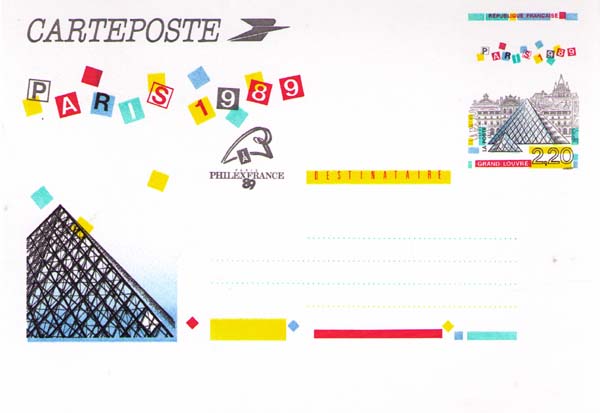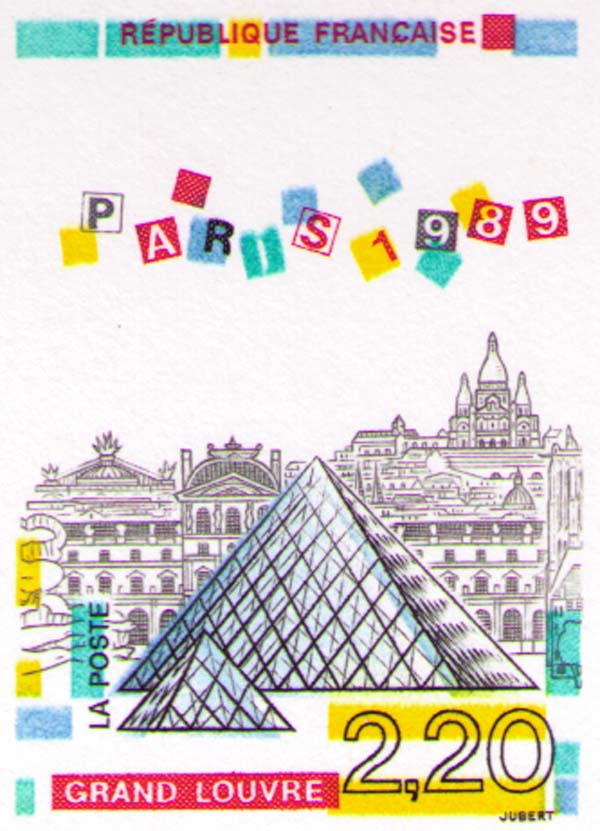 На марке: Лувр, пирамида Лувра.