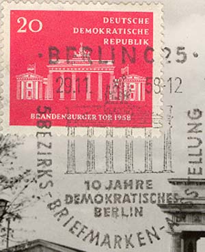 Берлин. Филателистическая выставка «10 лет демократическому Берлину». Бранденбургские ворота.