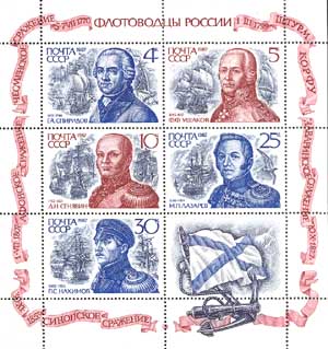 Портрет Федора Ушакова по мотивам картины П. Н. Бажанова на фоне кораблей, штурмующих остров Корфу. На переднем плане — флагманский корабль 84-пушечный «Святой Павел».