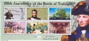 Марка издана в блоке. На поле блока — портрет Нельсона (Лемюэль Фрэнсис Аббот, 1798—1799, Гринвич, Национальный морской музей).
