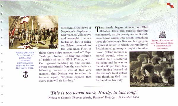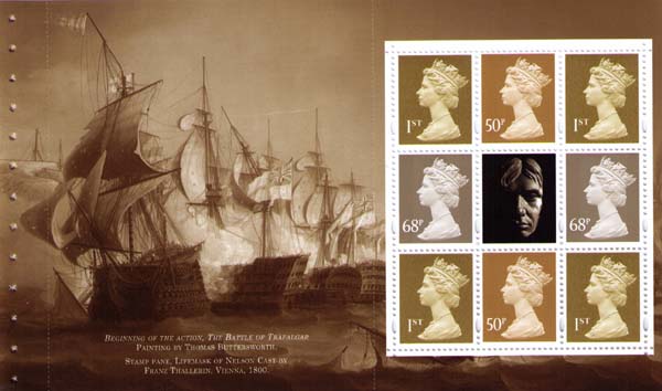 На страницах буклета —схемы Трафальгарского сражения, картины морских сражений, в том числе «Корабли, на которых служил Нельсон» (Николас Покок, 1808, Гринвич, Национальный морской музей, изображены корабли HMS «Agamemnon», HMS «Captain», HMS «Vanguard», HMS «Elephant» и HMS «Victory»), портреты адмиралов Нельсона и де Вильнева. На купоне — посмертная маска адмирала Нельсона (Франц Таллерин). На задней обложке буклета — сигнал, поднятый Нельсоном во время Трафальгарской битвы: «Англия надеется, что каждый исполнит свой долг».