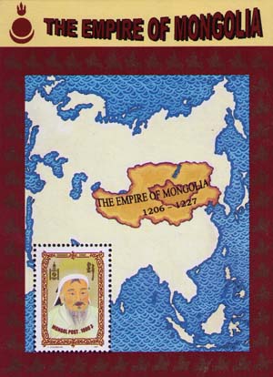 Марка издана в блоке. На поле блока — границы Монгольской империи в 1206—1227.