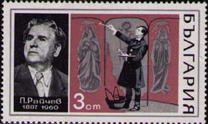 Портрет оперного певца Петра Райчева (1887—1960) и сцена из оперы Пуччини «Тоска», созданой по мотивам пьесы Сарду.