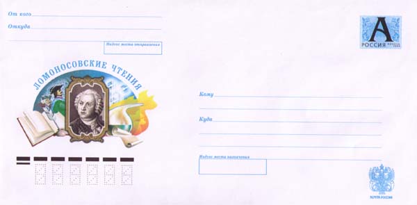Архангельск. Ломоносовские чтения. Портрет Ломоносова (Леонтий Миропольский, 1787, Санкт-Петербург, Музей Ломоносова), фрагмент мозаики «Полтавская баталия» (Михаил Ломоносов и ученики, 1761—1765, Санкт-Петербург, Академия наук), книга, колба.