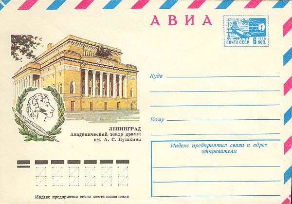 Авиа. Ленинград. Академический театр драмы им. Пушкина. Внизу —автопортрет Пушкина в лавровом венке.
