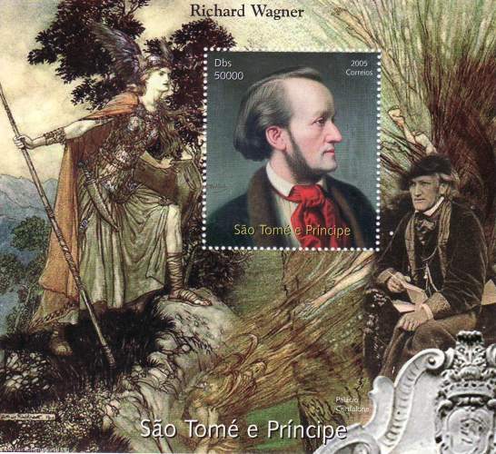 Марка издана в блоке. На поле блока — Рихард Вагнер, Валькирия — мотив оперного цикла Рихарда Вагнера «Кольцо Нибелунгов».