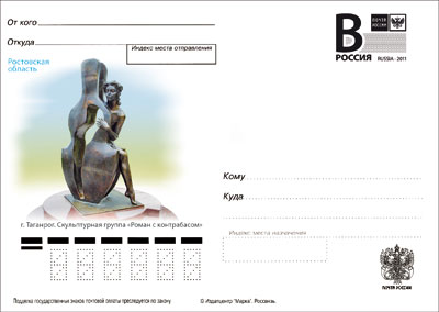 На карточке: Таганрог. Скульптурная группа «Роман с контрабасом». Скульптурная композиция создана по мотивам рассказа Антона Чехова «Роман с контрабасом» (скульптор Дмитрий Лындин, 2008).