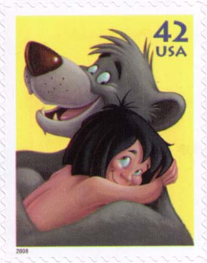 Герои мультфильма студии Уолта Диснея «Книга джунглей». На обороте марки текст о мультфильме.