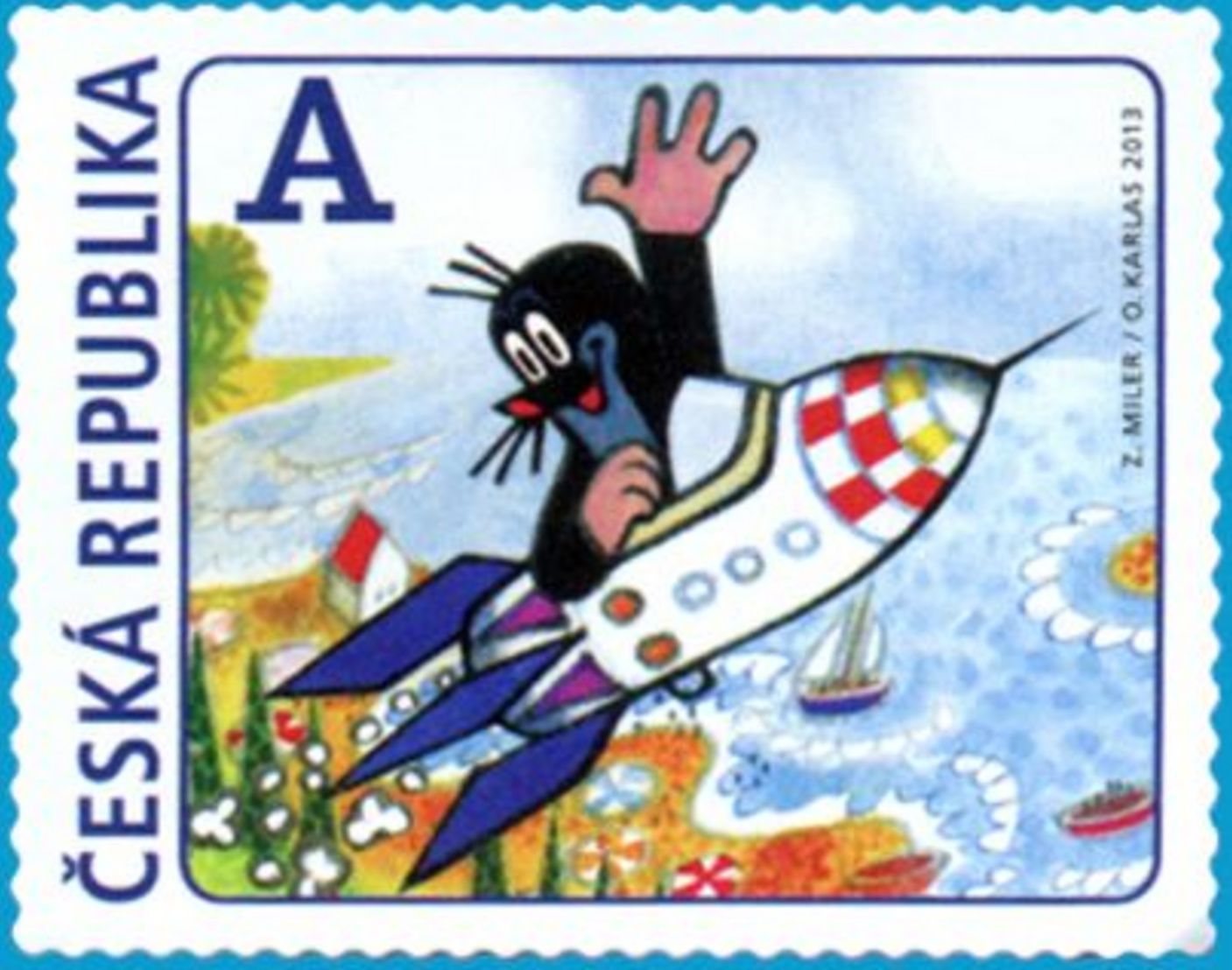Кротик, персонаж книг и мультфильмов Зденека Милера, летит на ракете.