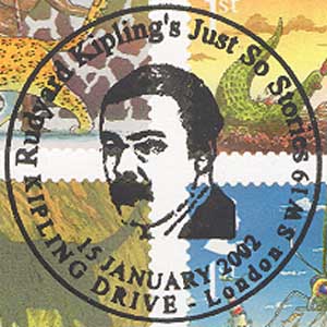 Лондон, проезд Киплинга, SW19. Первый день серии марок «100 лет публикации «Сказок» Киплинга». Портрет Киплинга.
