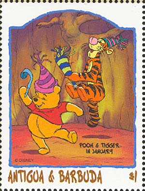 Philatelia.Ru / Детская литература / Марки / Винни-Пух и Тигра празднуют Новый годСерия: Через годы с Винни-Пухом