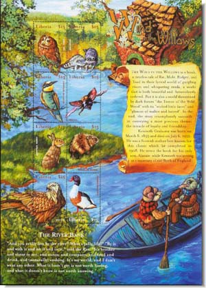 Марки изданы в малом листе. На полях листа — Крот и Барсук, плывущие на лодке, текст о сказке «Ветер в ивах» и об ее авторе.
