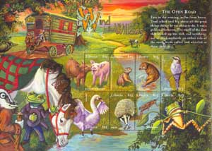 На марках, изданных в малом листе — животные Англии. На поле листа — мистер Тоуд и Барсук.
