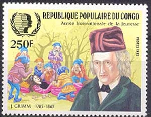 Портрет Якоба Гримма, сцена из сказки «Белоснежка и семь гномов».